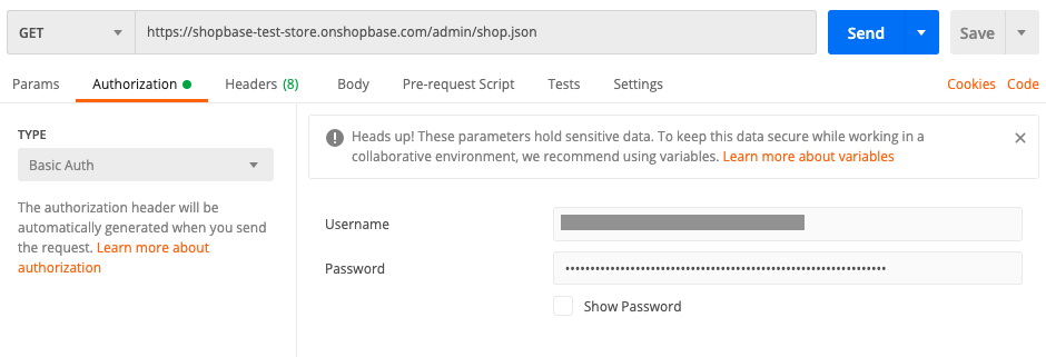 To make authorized requests to the ShopBase API from Postman, you need to generate private API credentials